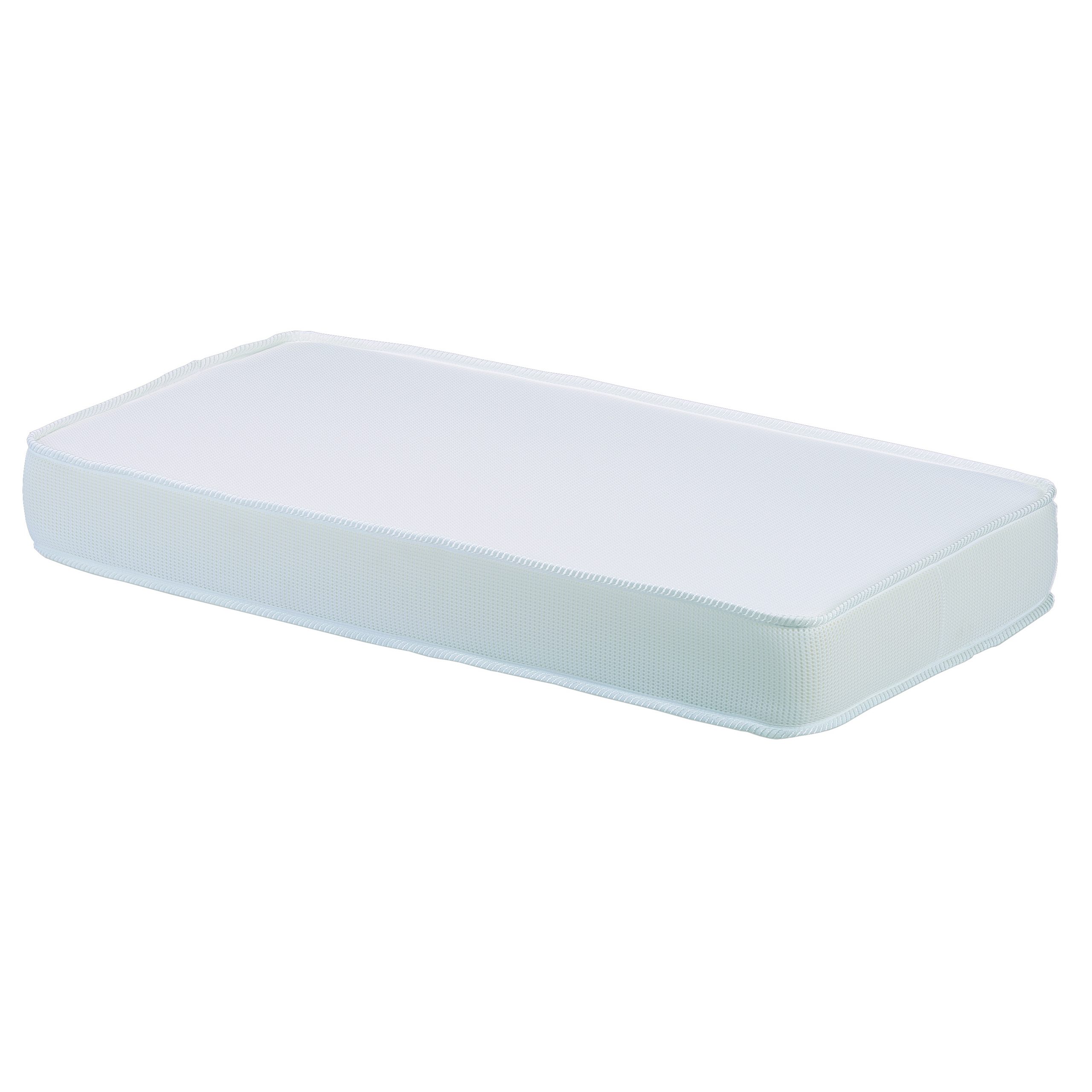 Colchón para cuna de espuma, está hecho de poliuretano de alta densidad y tiene un grosor de 10 cm. Sus dos caras y laterales están acabados con una rejilla respiral 3D, un sistema que promueve la transpiración y previene la acumulación de humedad, moho y ácaros durante el reposo.