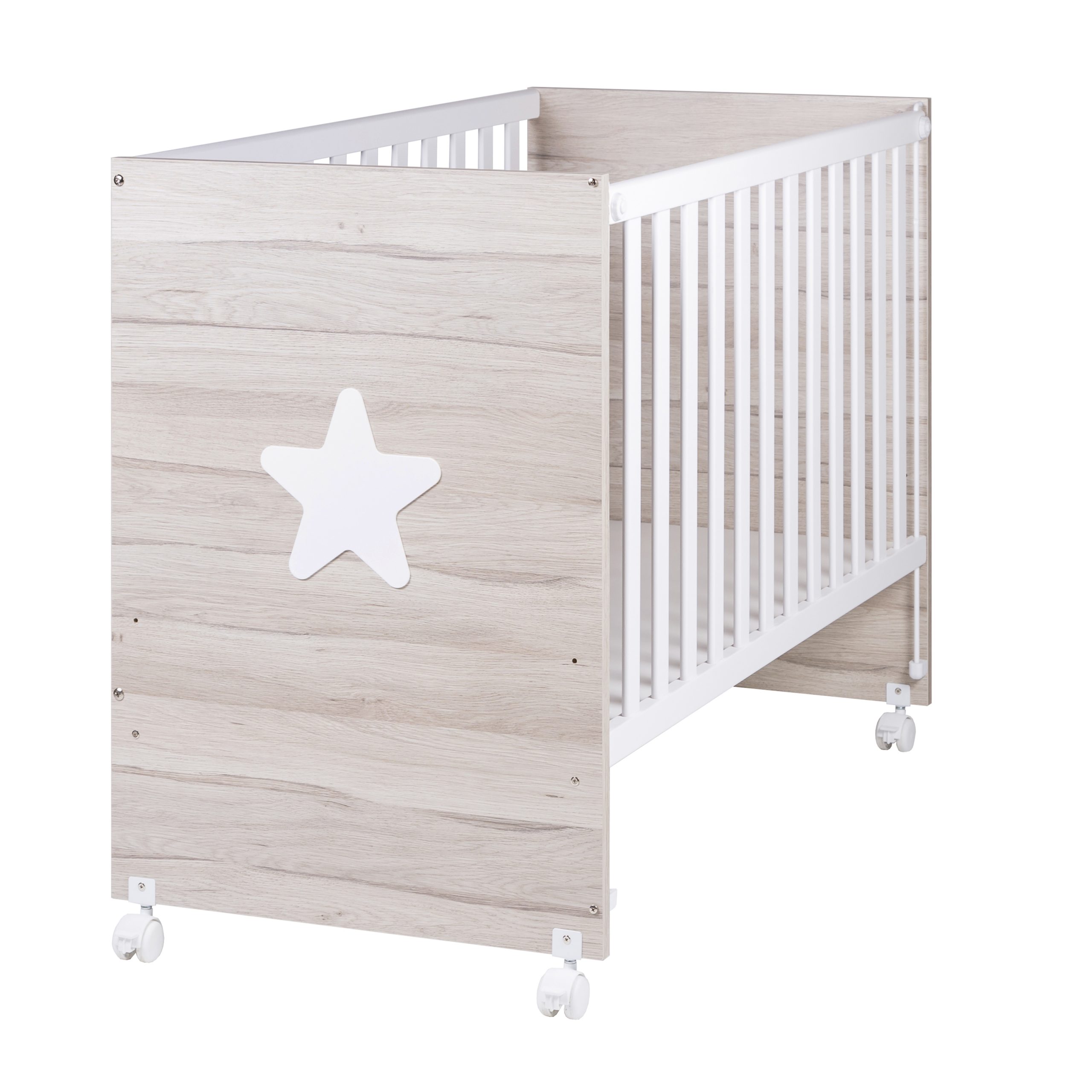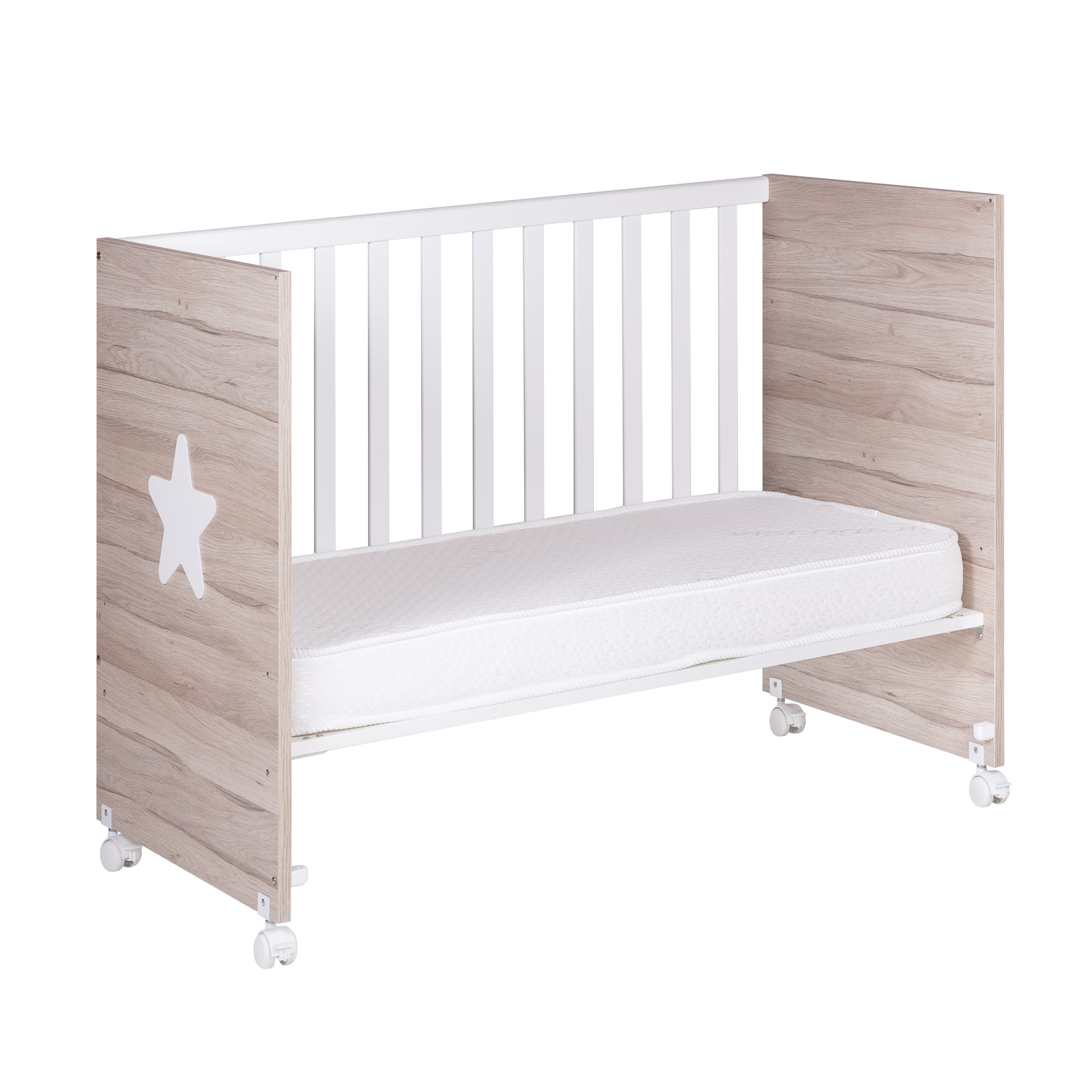 El somier de nuestra cuna cuenta con cinco posiciones y está fabricado con un material patentado que proporciona máxima seguridad para el bebé debido a la ausencia de agujeros u orificios, lo que permite utilizar colchones delgados. Con medidas de 124 X 94 X 67 cm, cuenta con cuatro ruedas, todas con freno, lo que permite una fácil movilidad.
